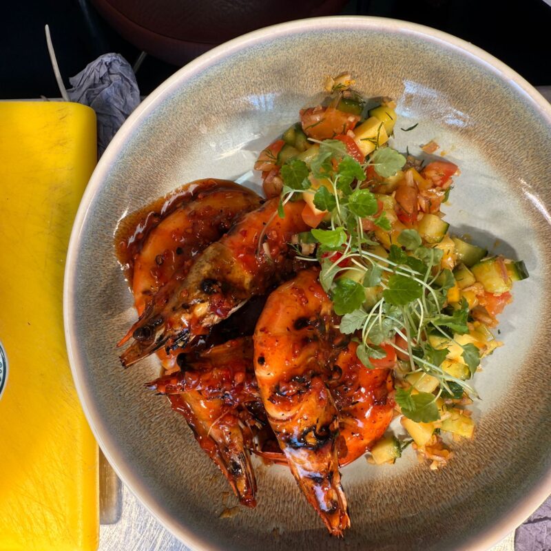 Grilled black tiger prawns served with garlic chilli sauce & tomato mango salsa