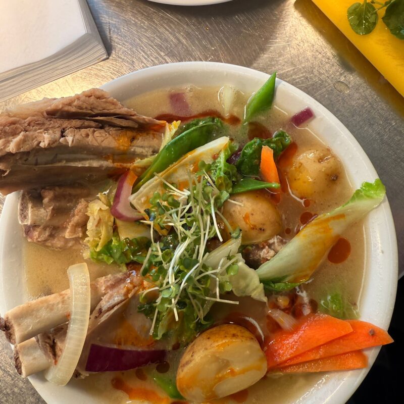 Braised short ribs in iconic Filipino peanut sauce served with steamed vegetables & a house-made shrimp paste
